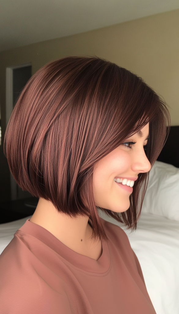 An angled bob in a deep mahogany shade with layered bangs that create depth and structure while maintaining a sleek finish.